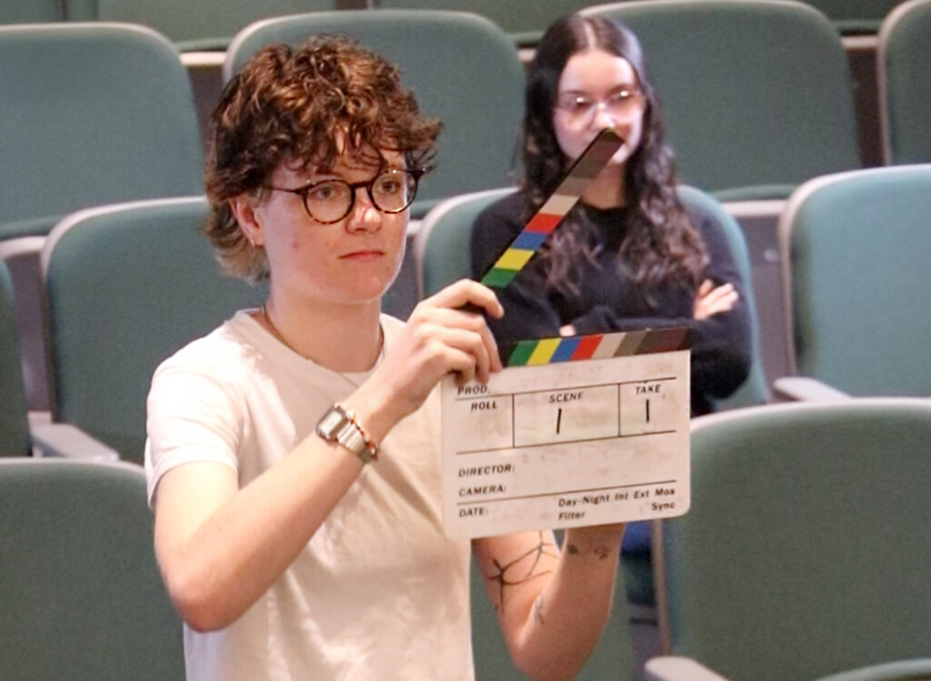 “Screenwriting got the scripts to his class, his students auditioned for the roles, and then my Filmmaking I students practiced directing,” Thompson explained. The joint filming session served as both rehearsal and real-world practice, helping actors grow more comfortable on camera and giving filmmaking students the chance to direct performers in a professional-style environment.