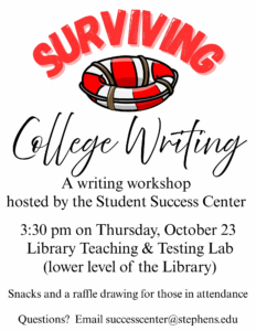 Please join the Student Success Center for a writing workshop, including snacks and a raffle! The event will be held at 3:30 p.m. on Oct. 23 in the Library Teaching & Testing Lab (lower level of the Library).